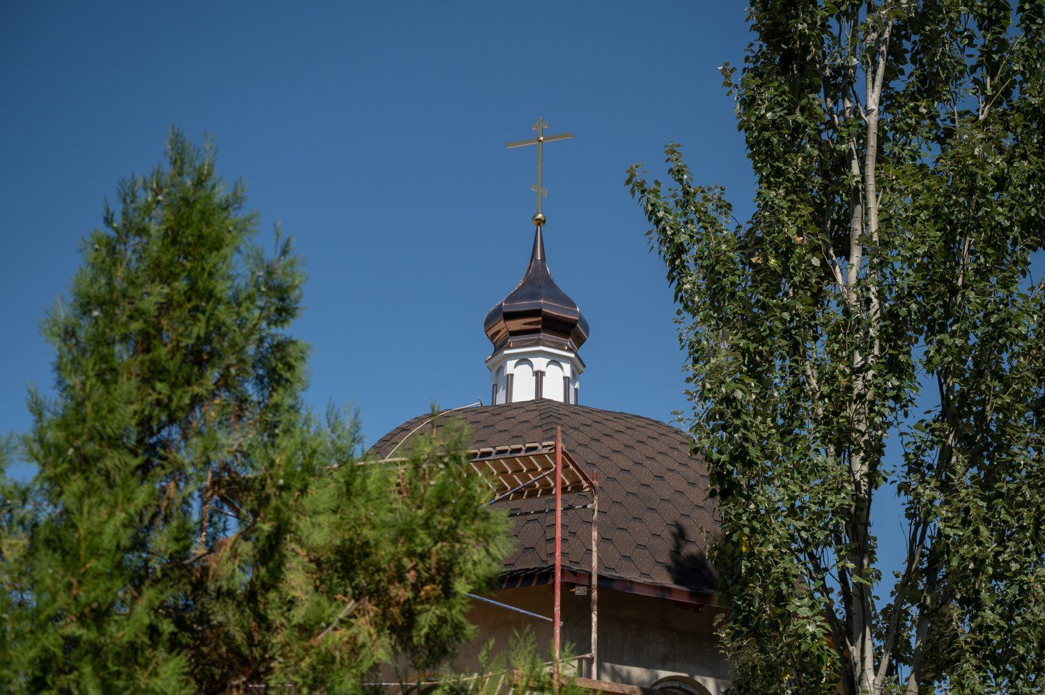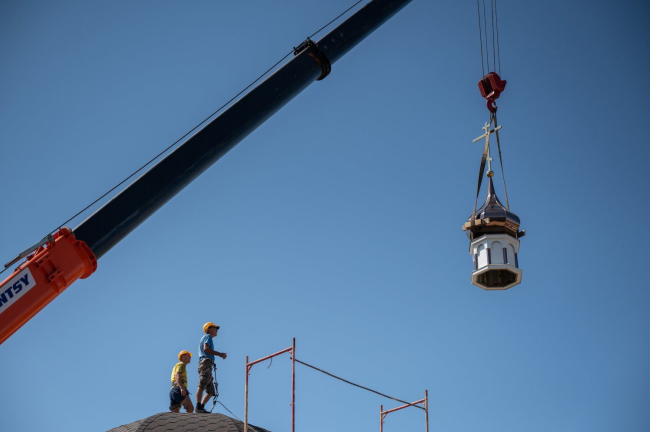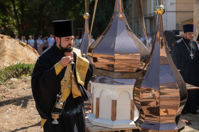 04 Aug., 2022, 21:09The university church construction continues in Tiraspol. The Church of the Holy Martyr Tatiana was built on the territory of the campus. A stone building on a solid foundation replaced a temporarily installed wooden temple. Finishing work is ahead. The first of three domed crosses was hoisted today. Its consecration was held by the Archbishop of Tiraspol and Dubossary Sawa. Svetlana and Vadim Krasnoselsky were the significant event witnesses.