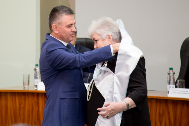 The chair of the Women's Strike Committee, Galina Andreyeva, was officially awarded the title of Honorary Citizen of Tiraspol. The president personally handed her the ribbon and the certificate.
