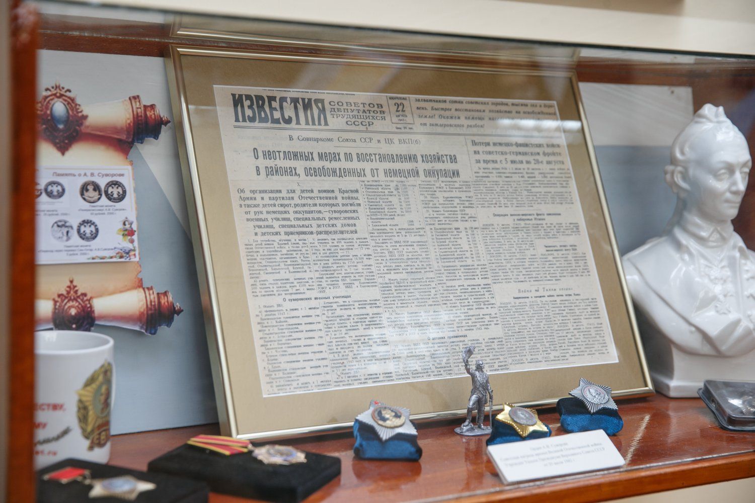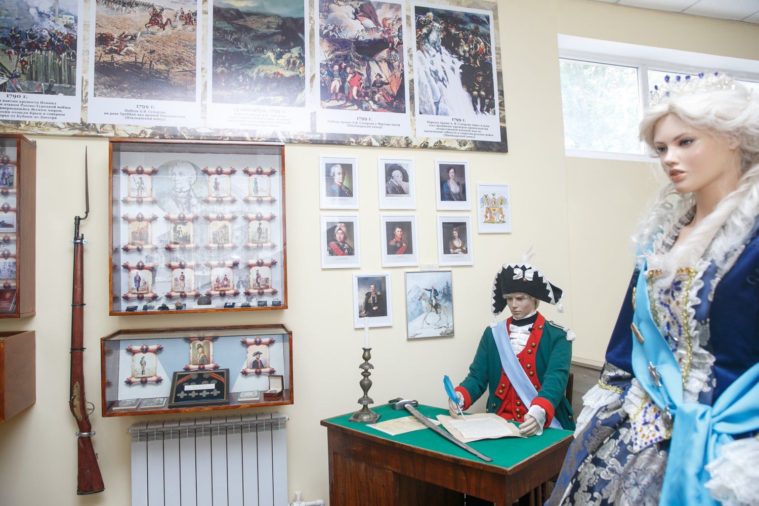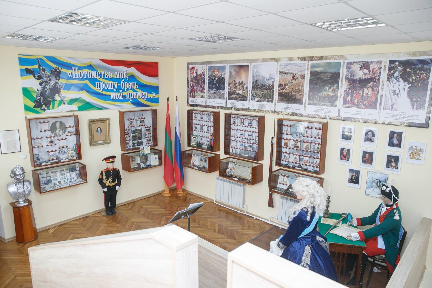 The symbolic red ribbon was cut by a Suvorov cadet and a student from the dance studio operating at the Palace of Children's and Youthful Art. The guide recounted significant historical events and dates associated with Suvorov's biography, as well as the founding, development, and growth of Tiraspol. She told the first visitors about the museum exhibits: photographs, copies of documents and maps, and replicas of awards and weapons. She also mentioned famous Tiraspol residents who were awarded the Order of Suvorov. She described the ships, atoll, and asteroid named after the Generalissimo. The museum features an installation depicting Alexander Suvorov composing a report to Empress Catherine the Great.