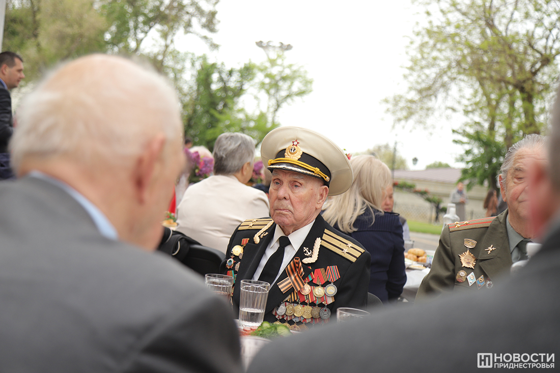 About six hundred veterans of the Great Patriotic War and persons equated to them – blockade runners, prisoners of fascism, disabled veterans of the Second World War, widows, home front workers live in Pridnestrovie. Those who participated in the hostilities of 1941-1945 are known by name. There are only a few in every city. Tiraspol is richer than the rest in this respect. Almost half of the living Pridnestrovian veterans who passed the military path during the Second World War live in the capital. Participants in hostilities Vladimir Ivanovich Gromov, Alexei Ivanovich Zhdanov and Konstantin Ivanovich Puganov, home front worker Galina Semyonovna Shcherbina, veteran of the Armed Forces Valery Ivanovich Glazkov and his wife Valentina Fedorovna shared memories of those years with the PMR President today. In total, a dozen tables were festively set in the square. Heads of public authorities and administration, as well as representatives of public organizations and veteran movements were invited to the event in addition to veterans of the Great Patriotic War.