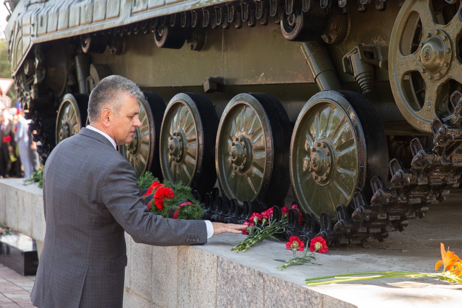 The PMR President Vadim Krasnoselsky lays flowers on behalf of the entire Pridnestrovian people. The procession of the memorial complex begins at the Eternal Flame, lit on the first anniversary of the Bendery tragedy at the pedestal of the Infantry Fighting Vehicle, a combat vehicle that participated in the defense of Pridnestrovie. The metal survived the war, but eight crew members did not. The names of two remain unknown.