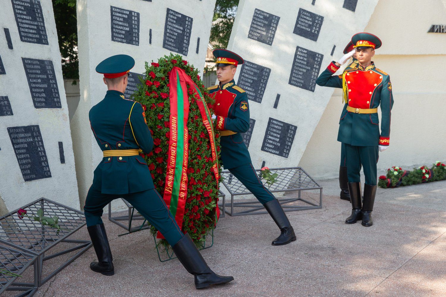 The next point on the memorial procession is the chapel-bell tower, erected on the territory of the memorial in 1995 on the occasion of the 5th anniversary of the republic. Next is the monument to General Lebed, who stopped the bloodshed, and the wall of memory, on five slabs of which the names of the dead are carved. The wall not only preserves memory, but also symbolizes the defense of the city. The PMR President laid a presidential wreath at it.
