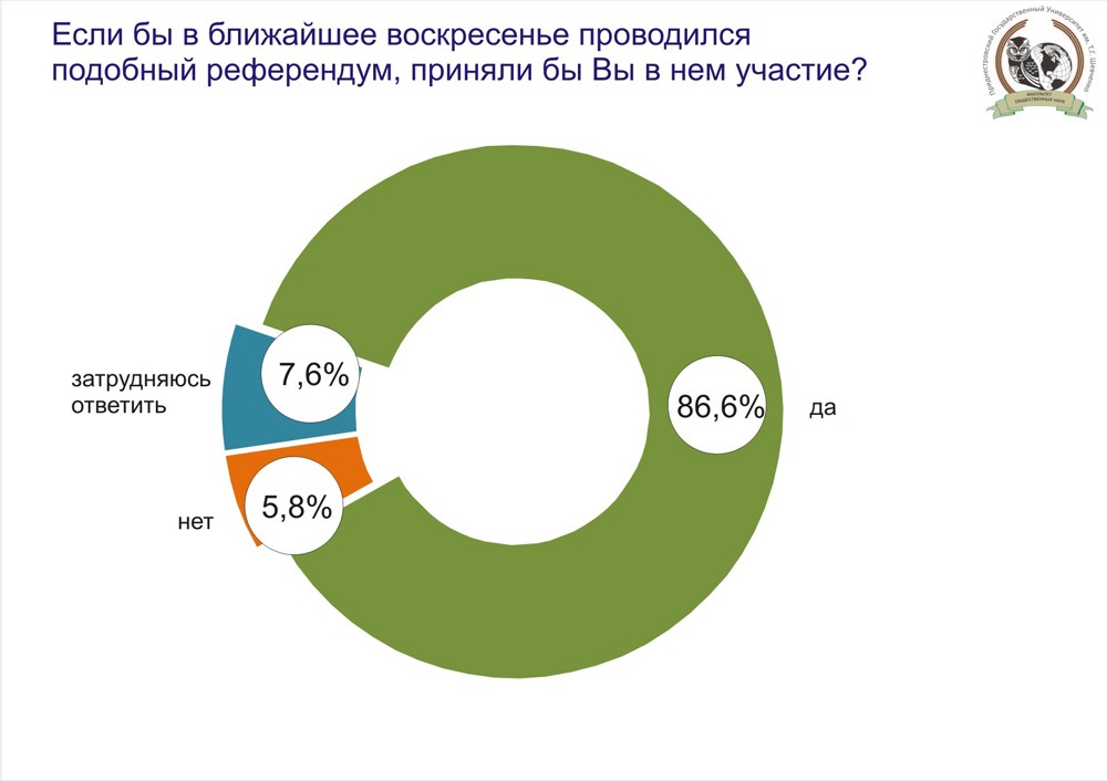 65.4% of the poll participants noted that they had given their voice for Pridnestrovie's independence at the 2006 referendum. 3% of the pollees had voted for the rejection of Pridnestrovie's independence and subsequent accession to Moldova. 21.8% said they had not participated in the referendum.