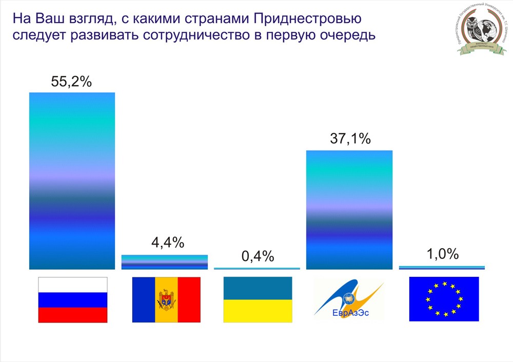 In the meantime, 92.3% of respondents consider that Pridnestrovie should, first of all, develop cooperation with Russia and Eurasian Union countries. 4.4% of citizens regarded relations with Moldova as a priority, 0,4% with Ukraine, and 1% with the European Union.