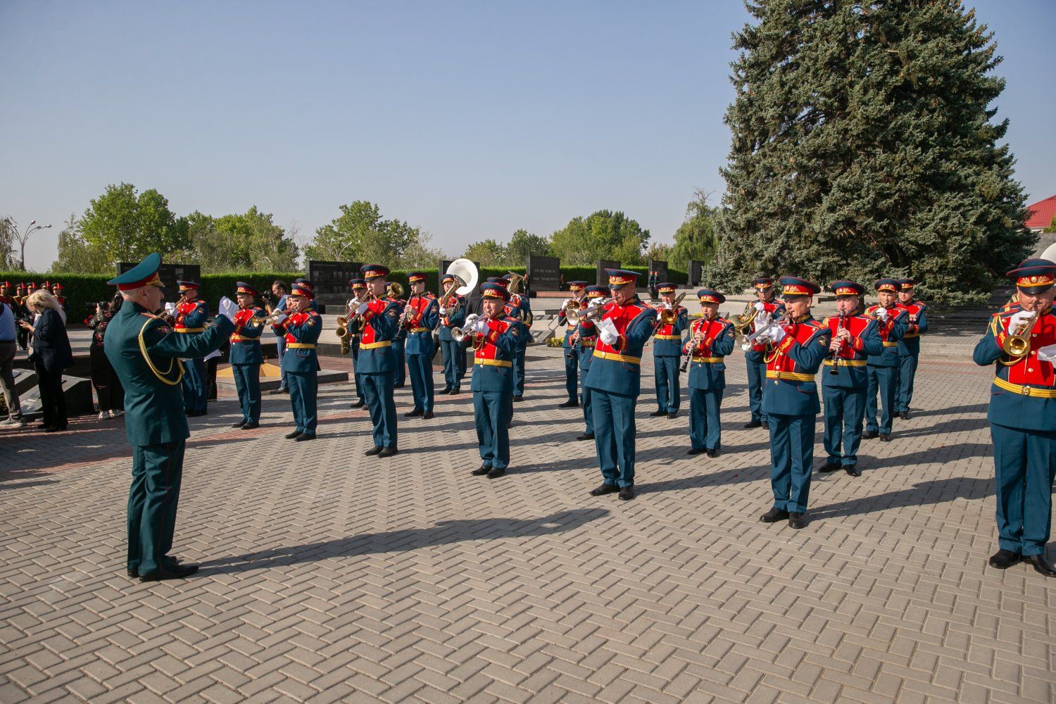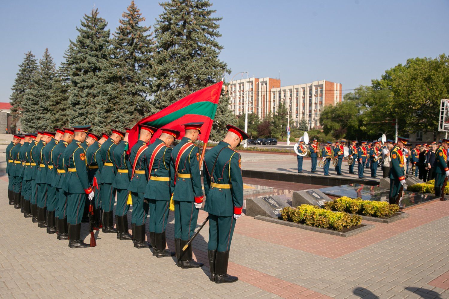 The Honor Guard Company and the orchestra of the General Staff of the Armed Forces of the PMR marched ceremonially to the flagpole to participate in the Flag Raising Ceremony of the Pridnestrovian Moldavian Republic at the end of the memorial and ceremonial event.
