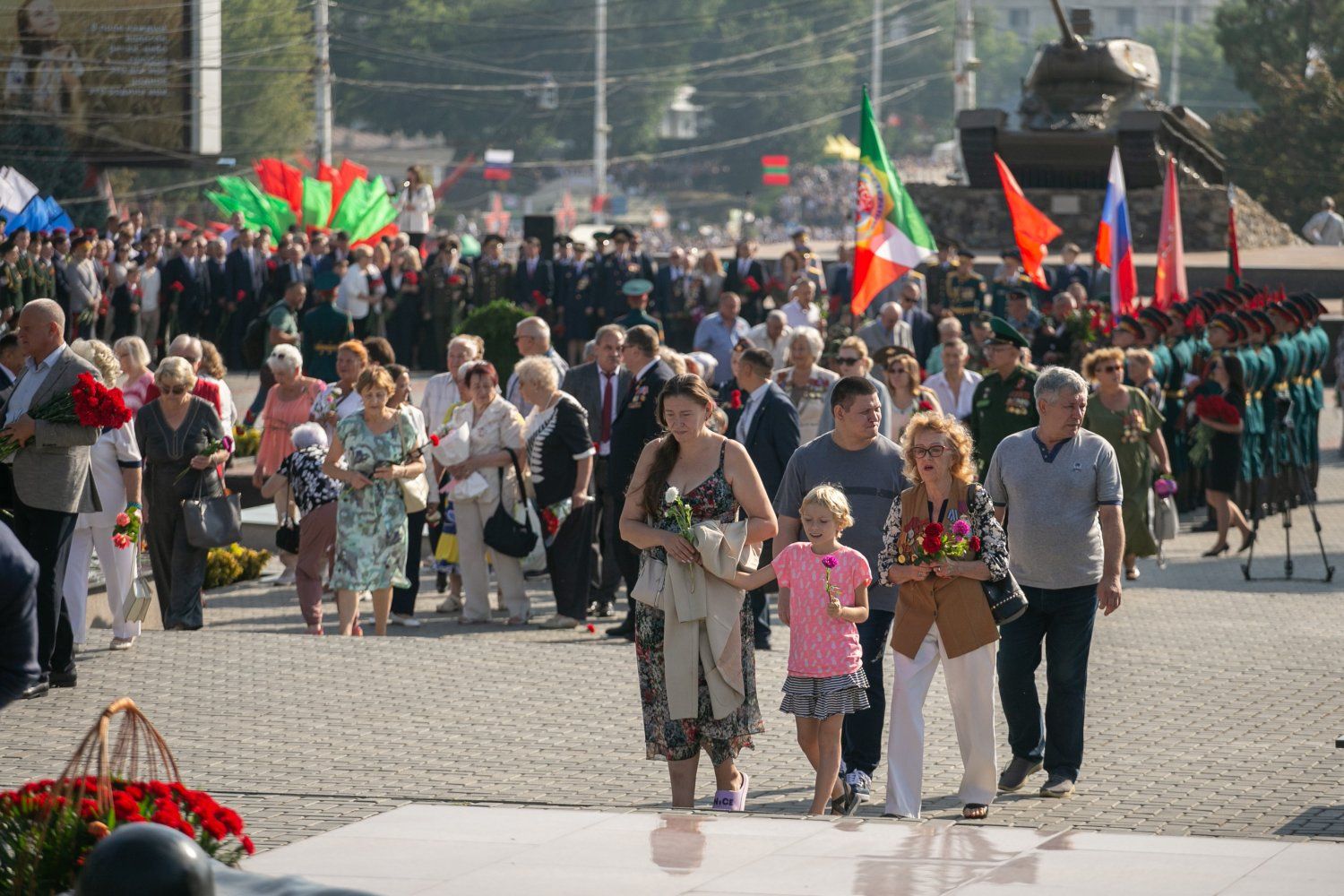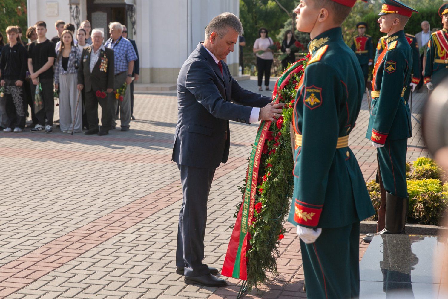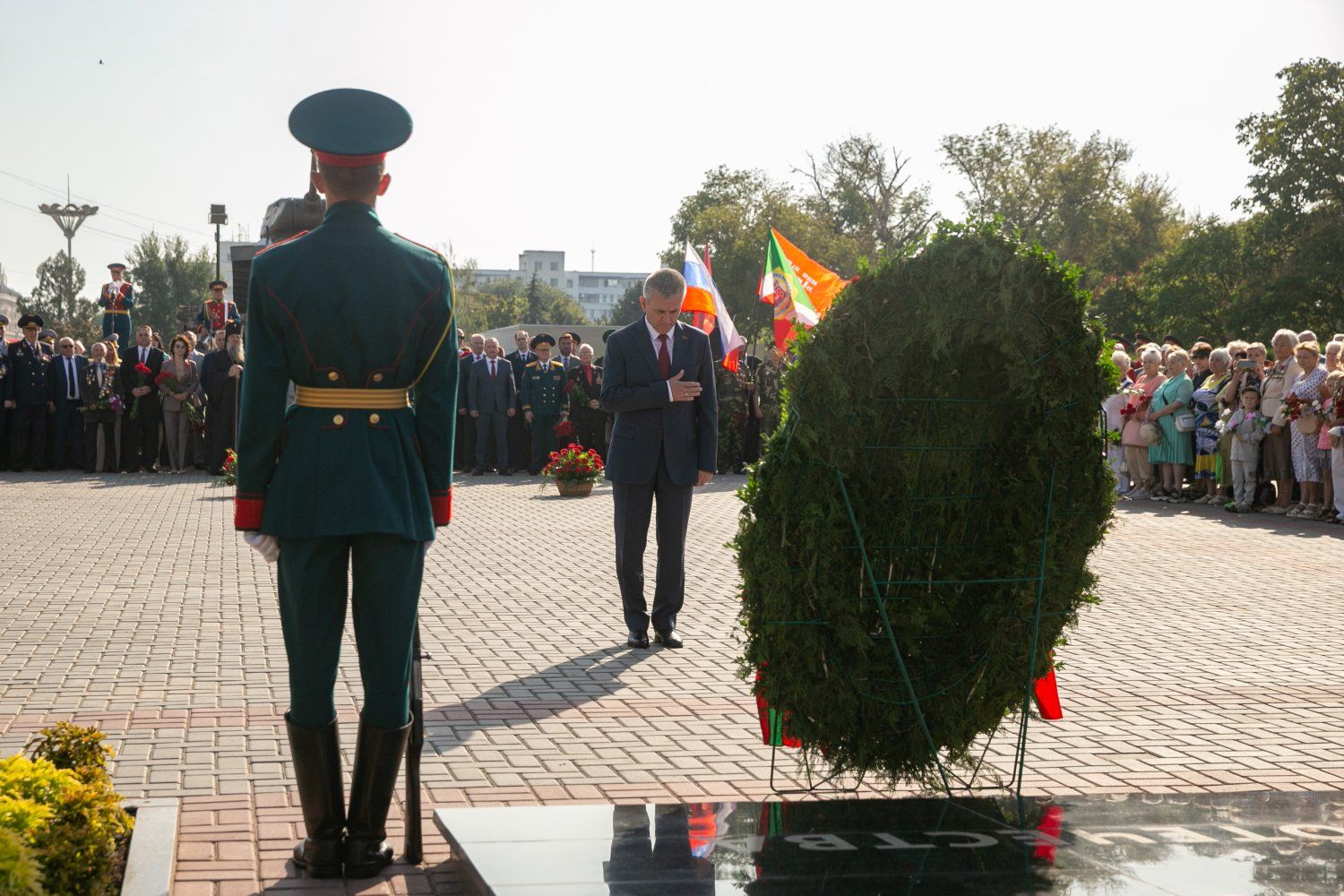 The heads of state authorities and administration, the First President of the PMR Igor Smirnov and his associates who participated in the events of the period of the creation of the young republic, official representatives of foreign states, clergy led by Archbishop of Tiraspol and Dubossary Sawa, military personnel, cadets, Suvorov cadets, public figures, Tiraspol residents and guests of the city took part in the flower-laying ceremony.