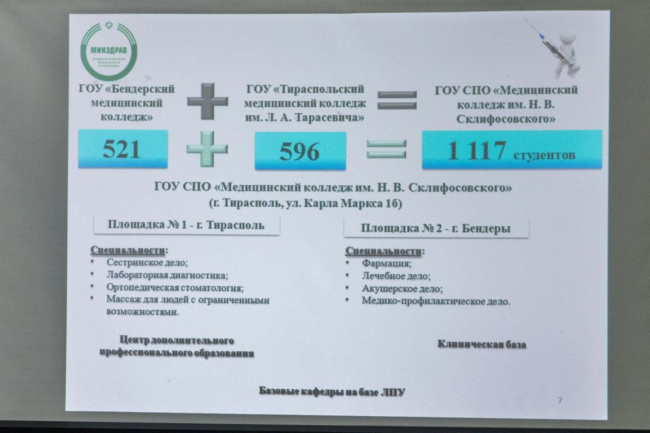 19 May., 2022, 12:02A meeting dedicated to the improvement of the educational network in the field of training medical personnel was held at the site of the Administration of the President of the Pridnestrovian Moldavian Republic. It was about institutions of secondary vocational education. There are two medical colleges in Pridnestrovie to date: the Tiraspol colleges named after Tarasevich (established in 1930) and the Bendery colleges (its history dates back to the post-war 1945). Both institutions are state-owned. There has been a tendency to reduce the number of students in each of them in recent years. There is a situation of functioning of small groups. The infrastructure is not fully used. The material and technical base of colleges requires updating, but it is impractical to re-equip and modernize functionally identical classrooms and practical training facilities in two educational institutions. They said at today's meeting under the President that a number of specialties are duplicated in educational institutions: nursing, laboratory diagnostics, obstetrics, medical care, medical and preventive care. The Ministry of Health took the initiative to merge two educational institutions and create a State general educational institution of secondary vocational education "N. V. Sklifosovsky Medical College" on its basis. The participants of the working discussion discussed the reorganization project presented by the Minister of Health of the Pridnestrovian Moldavian Republic Kristina Albul. There will be two educational platforms. Nurses, laboratory staff, specialists in the field of orthopedic dentistry and massage therapists will be trained for people with special life needs in Tiraspol. The Bendery division will focus on the training of pharmacists, obstetricians, as well as medical professionals specializing in medical and preventive medicine. The unified clinical base is planned to be replenished with new areas, such as cosmetology and phytotherapy rooms, treatment, massage, physiotherapy rooms, mini-operating unit. There are plans to create a Center for additional vocational education, the resources of which will be used for advanced training and retraining of medical workers. It is estimated that optimization will significantly increase the salary of employees. The reduction of teachers working on a permanent basis is not expected. The concept of external part-time work will become a thing of the past, in which mainly medical workers who do not have a pedagogical education are involved at the moment. This step will become an effective motivational tool for improving the skills of teaching staff, representatives of the Ministry of Health and the Ministry of Education of the Pridnestrovian Moldavian Republic who took part in the meeting noted. The deputies of the Supreme Council, who head parliamentary committees working on legislation in the field of education and healthcare, asked detailed and clarifying questions during the discussion.