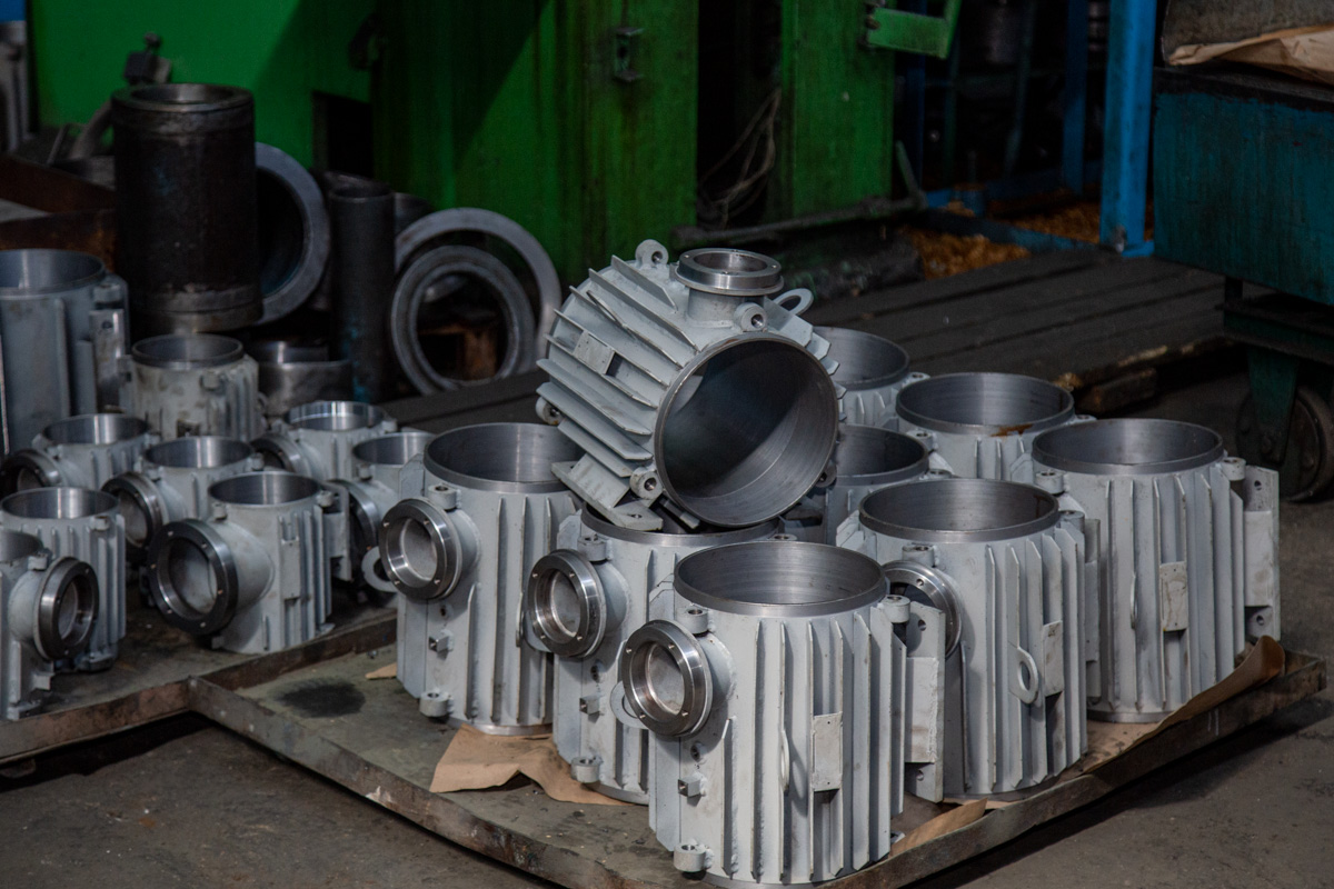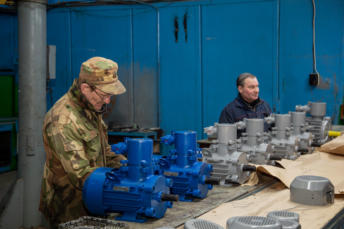 The next location is a workshop for the production of small electrical machines. This is where small pumps, machine tools and consumer goods come from. For example, they collect UBDNs - woodworking machines. It all starts with a drum, an engine; they are already in the package at the end of the process. Nearby is the first batch of new pumps. They are designed for pumping wine in a subsidiary farm; they are red, like the wine. They are not on sale yet, they will only be available since April.