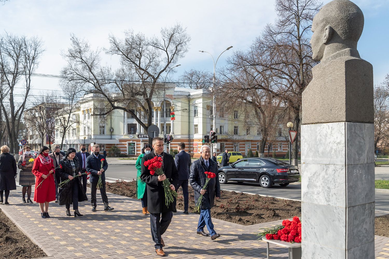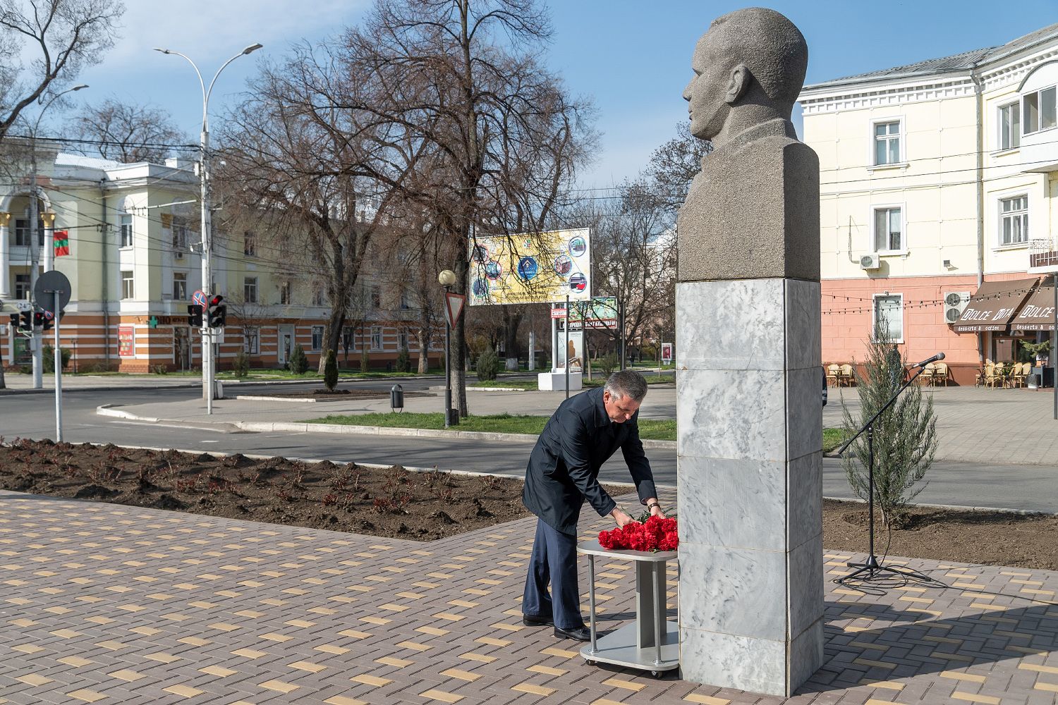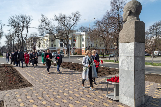 12 Apr., 2021, 11:45The PMR President Vadim Krasnoselsky laid flowers at the portrait sculpture of Yuri Gagarin installed in the capital in 1977 today, the day of the 60th anniversary of the first manned space flight. The monument is located on the boulevard named after the Soviet cosmonaut. The ceremony was attended by the Head of the presidential executive office, representatives of the Supreme Council, the Head of the Tiraspol administration, the Chairman of the local council, the rector of Pridnestrovian State University and other officials.