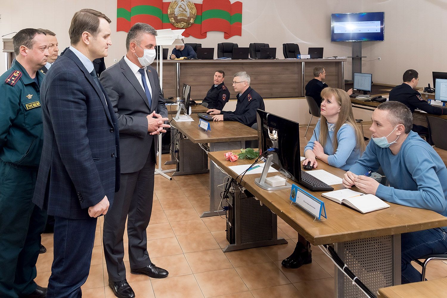 Today is the first day of the center. The President arrived to get acquainted with the organization. The Minister of Internal Affairs Ruslan Mova introduced the Head of the Crisis Center to Vadim Krasnoselsky. Vadim Shmalenko, the Head of the Main Directorate for Emergency Situations of the PMR Interior Ministry was appointed to this position. The President was told that organizational and commissioning work was carried out over two days - Thursday and Friday. The center has been working in test mode in a weekend. Today is a full-time work day for three dozen specialists of different directions. Before lunch, 226 calls were received in electronic form and about four hundred calls were received. Workplaces are equipped with all necessary and are located in such a way as to ensure a quarantine distance between employees. The hall is divided into four zones. The first is to receive calls coming to the hotline. If possible, the operator consults, if the issue is not in his competence, he redirects it to the representative of the profile service. The two sectors bring together specialists in the domestic policy. Employees of ministries, departments and services are in charge of foreign policy issues, including interstate movement of citizens in the fourth zone. There is no paper workflow: all applications are accepted, processed and accumulated in electronic form. They deployed a server room on the spot, started up all the necessary communications, use a software product created two years ago on their own, Ruslan Mova informed. The center involves round-the-clock work. But at night, the room is disinfected, ventilated and cleaned. Employees recruited from other departments conduct receptions from 8.00 to 20.00 (during 12 hours). Applications received at night will be received by operational officers of the Ministry of Internal Affairs who are on duty, to process it and, if it is not possible to give an immediate qualified response, to transfer to specialized specialists in the morning.
