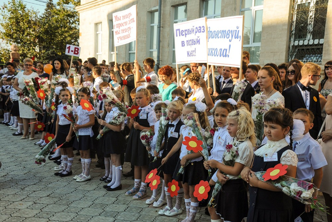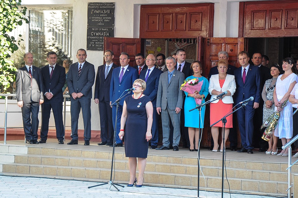 Today a whole delegation of guests has shared with gymnasium pupils the happiness of the first bell ceremony. Among the guests were Pridnestrovie's president, Yevgeny Shevchuk, minister of education, Tatyana Tsivinskaya, Russian ambassador to Moldova, Farit Mukhametshin, and the founder of ANO Eurasian Integration, Aleksey Zhuravlyov.