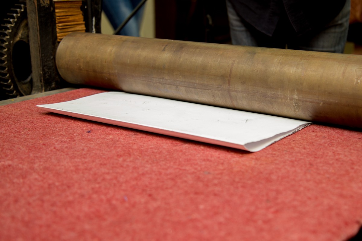 При печати применяют типографские краски. Как рассказал Сергей Панов, накатывать краску на линолеум лучше всего получается вальцмассовым валиком, при этом важно отрегулировать количество краски, наносимой на линогравюру: её не должно быть много, чтобы не залить мелкий штрих, и не должно быть мало, чтобы не возникли непропечатки.