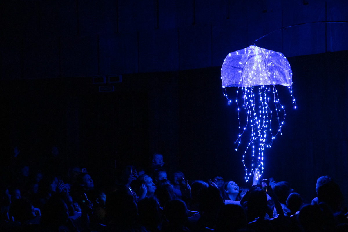 Такого необычного представления столичные зрители ещё не видели. Куклы разных форм и размеров поразили воображение не только ребят, но и их родителей. Над залом летали неоновые бабочки и жар-птица, танцевали светодиодные медузы.