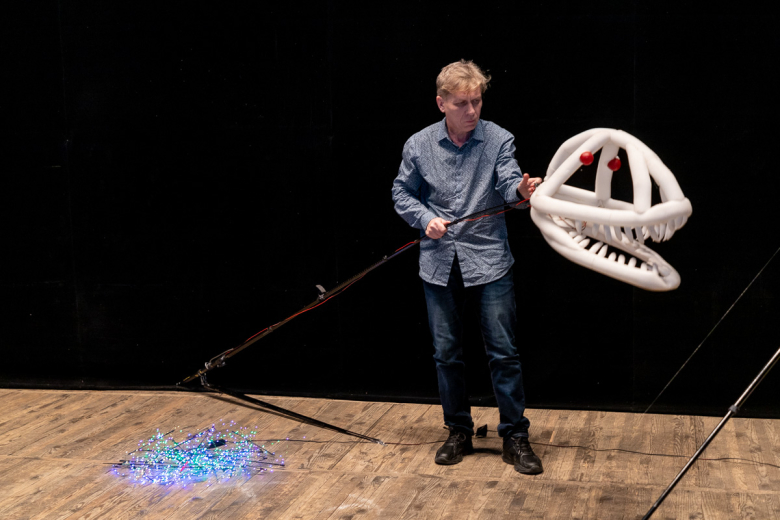 А ещё были весёлые человечки и 8-метровый скелетозавр, который собирался прямо на глазах у зрителя из фигур червяка, рыбы, паука, бабочки и змеи.