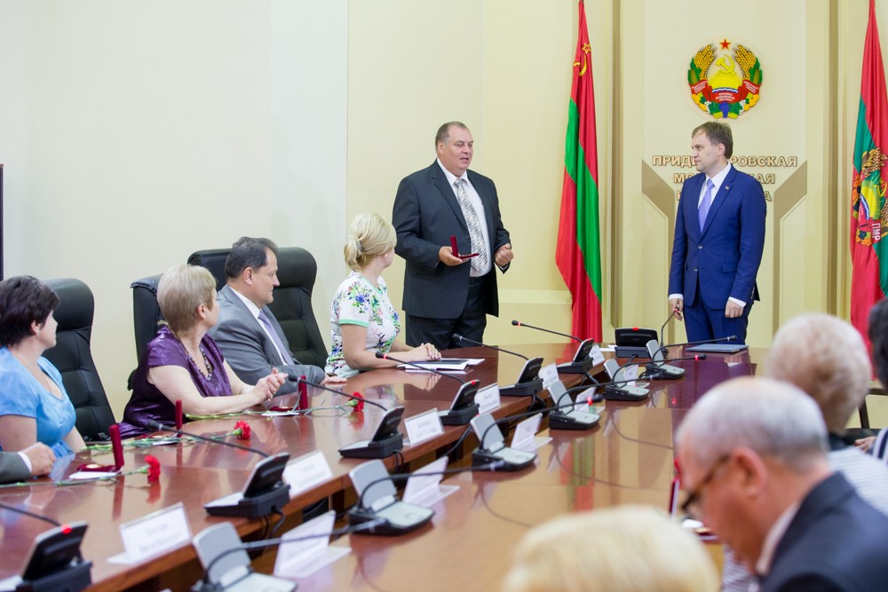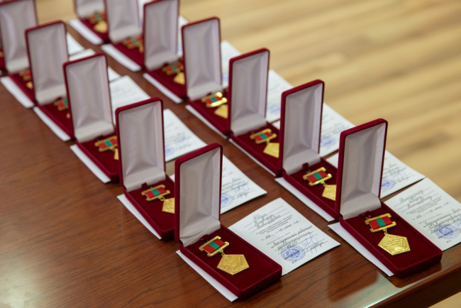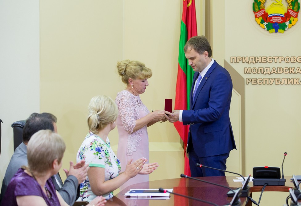 Благодарности Главы государства за многолетний добросовестный труд и высокий профессионализм были удостоены 16 человек. Лучшие в области медицины и легкой промышленности из рук Президента получили почетные нагрудные знаки «Заслуженный работник Приднестровской Молдавской Республики», сообщает пресс-служба Президента.
