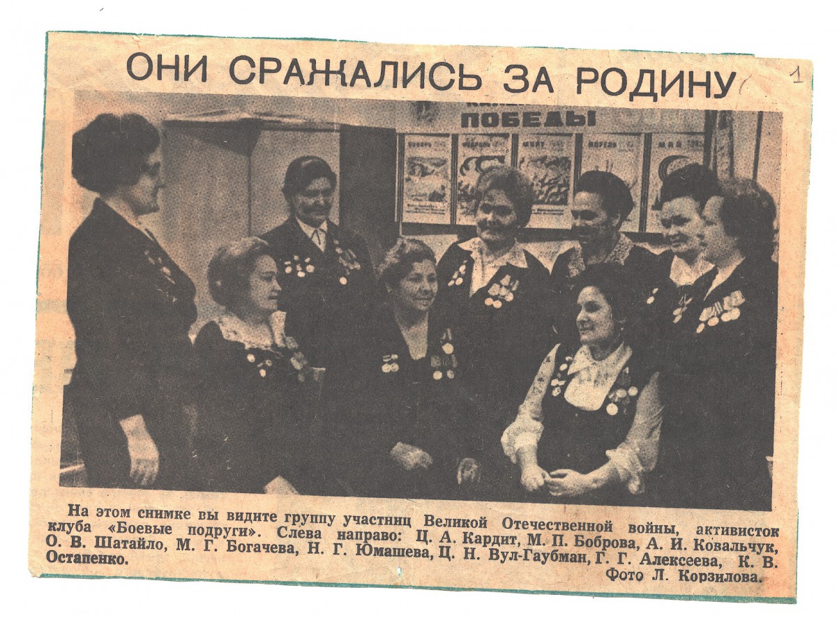 Это историческая справка о клубе «Боевые подруги» и фотография Л. Корзилова из газеты «Днестровская правда», на которой запечатлены участницы Великой Отечественной войны.