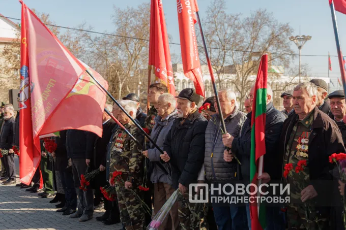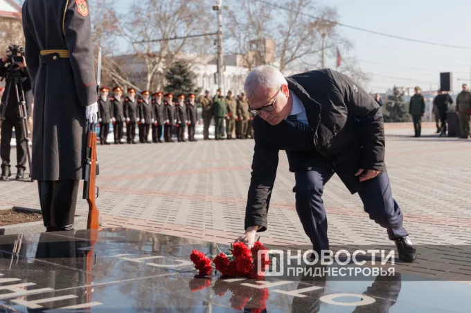 К Вечному огню цветы возложили первый Президент ПМР Игорь Смирнов, вице-премьер Правительства ПМР Виталий Нягу, вице-спикер Галина Антюфеева, представители органов власти, защитники Приднестровья, общественники и жители города.