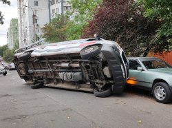Легковушка столкнулась с микроавтобусом, который опрокинулся на две припаркованные машины