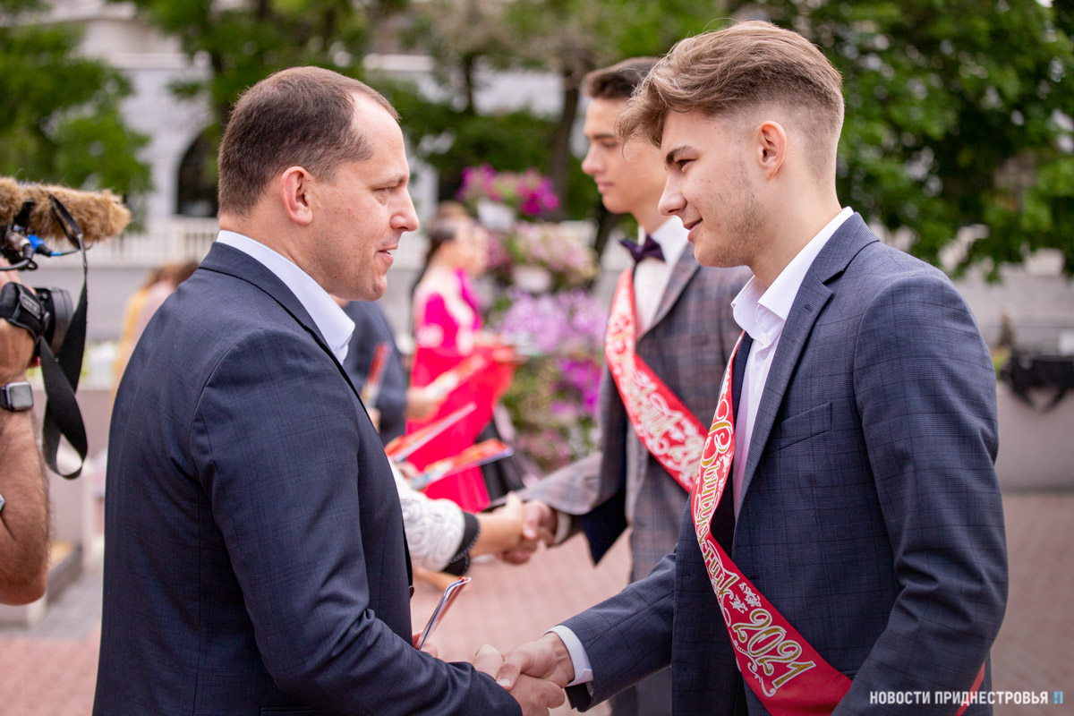 «В этот прекрасный день хочу поздравить вас с праздником - с днём, когда вы успешно и достойно завершили своё школьное образование. Вы приложили максимум усилий, где-то даже через не могу, но учились хорошо. И сегодня я очень рад присутствовать на этом мероприятии, потому что передо мной стоит наша золотая молодёжь, на которую мы надеемся. Мы уверены, что вы будете нашей достойной сменой и будете развивать нашу республику во благо приднестровцев», - отметил Александр Коршунов.