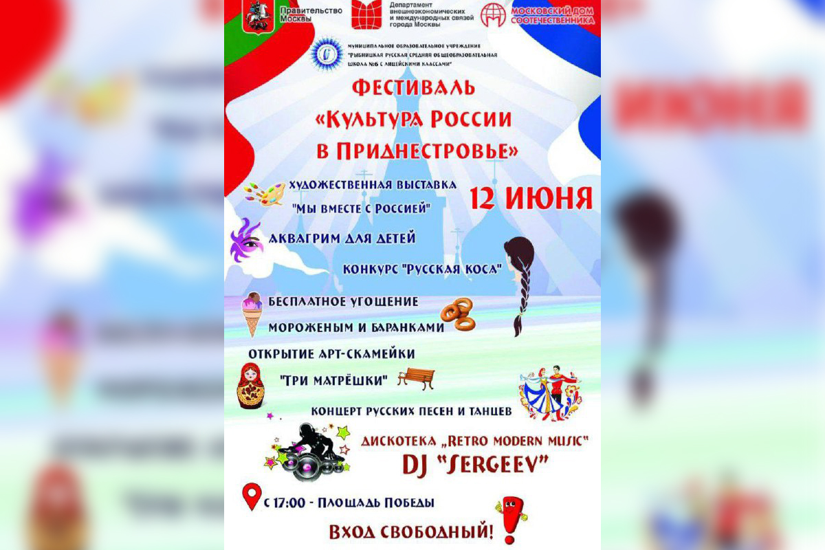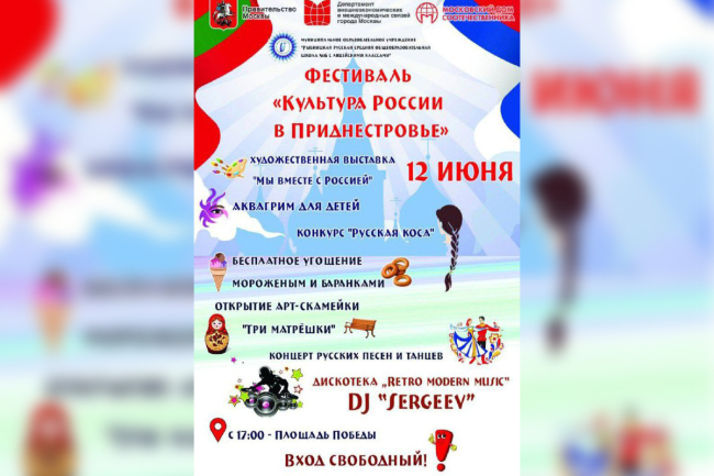 Рыбница, 10 июня. /Новости Приднестровья/. 12 июня в Рыбнице организуют праздничную программу ко Дню России – фестиваль «Культура России в Приднестровье». Его проведут на городской площади Победы в 17:00, сообщает местная госадминистрация.