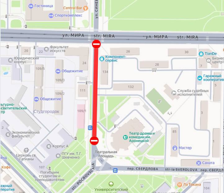 Тирасполь, 12 августа. /Новости Приднестровья/. с 19:30 до 21:30 14 августа в Тирасполе будет перекрыто движение автотранспорта по улице Покровской, от поворота с улицы Мира к Приднестровскому государственному театру драмы и комедии имени Аронецкой до поворота в сторону переулка Свердлова.