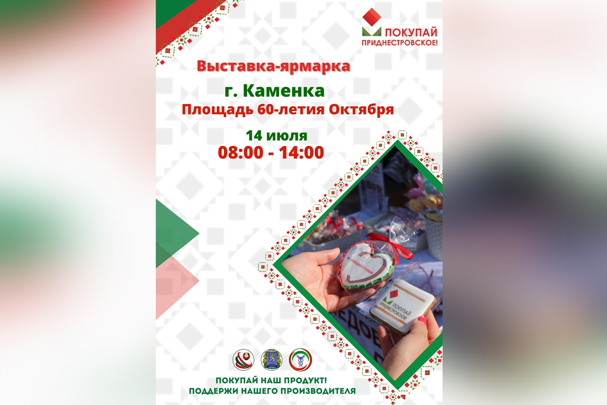 Каменка, 11 июля. /Новости Приднестровья/. Выставка-ярмарка «Покупай приднестровское!» в июле состоится в Каменке. Мероприятие проведут 14 июля с 08:00 до 14:00 на площади 60-летия Октября.