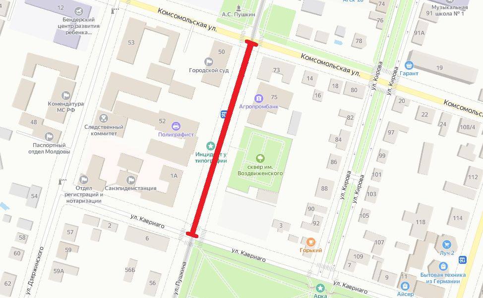 Бендеры, 15 февраля. /Новости Приднестровья/. 16 февраля в Бендерах с 8:00 до 12:00 будет перекрыто движение транспорта по улице Пушкина: от перекрёстка с ул. Комсомольской до пересечения с ул. Кавриаго.