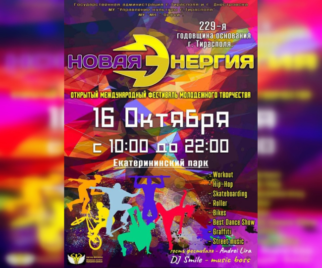 Тирасполь, 29 сентября. /Новости Приднестровья/. В столице 16 октября пройдёт Открытый международный фестиваль молодёжного творчества «Новая энергия – 2021», посвящённый 229-й годовщине основания города Тирасполь.