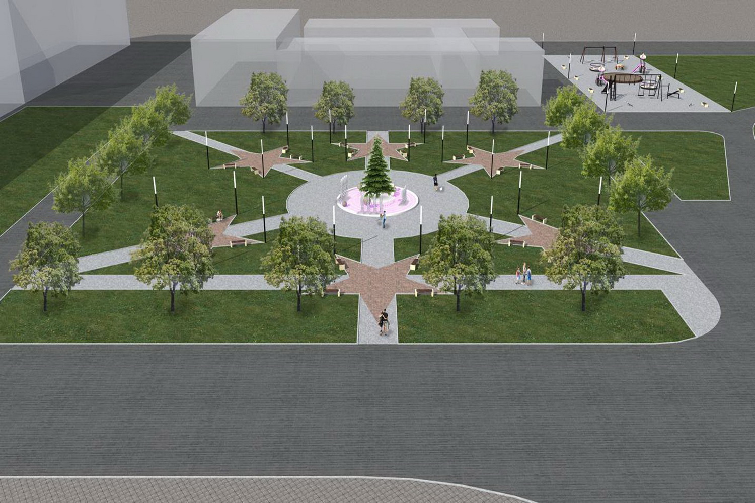 Сквер включает в себя спортивный комплекс и детский городок