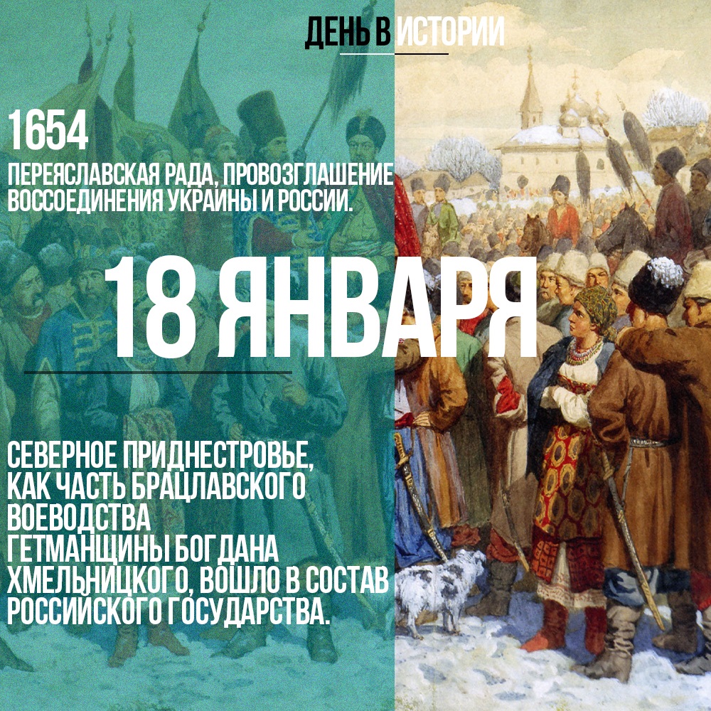 18 (8 января по старому стилю) января 1654 года – Переяславская Рада, объявление о воссоединении Украины и России.