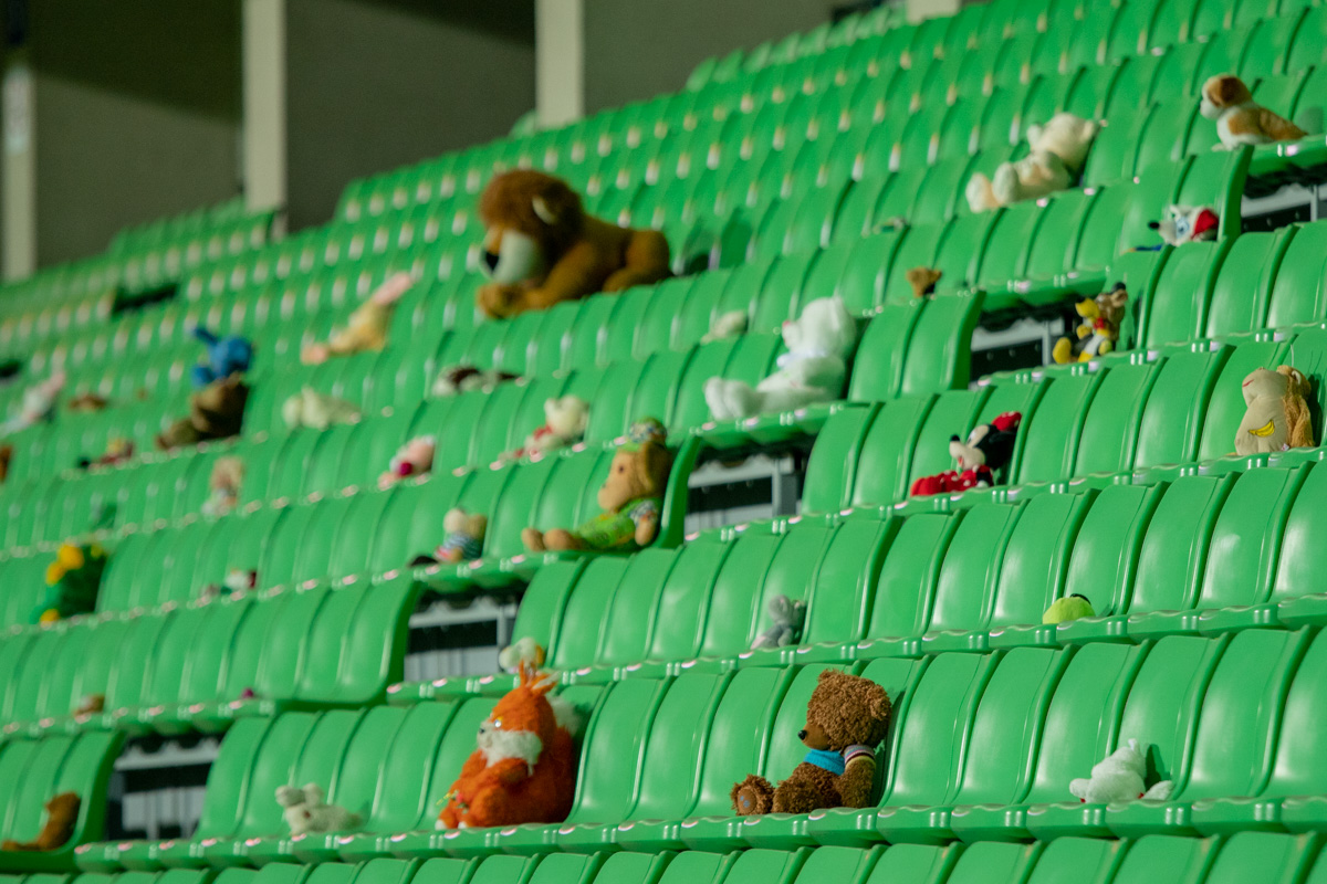 Товарищеский матч Россия-Молдавия. Из-за пандемии коронавируса трибуны пустуют. Вместо болельщиков - мягкие игрушки. Кишинев, 12 ноября