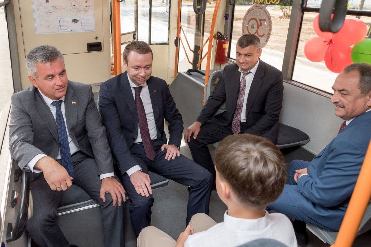 Президент Вадим Красносельский, премьер-министр Александр Мартынов и председатель Верховного Совета Александр Коршунов на открытии обновлённой троллейбусной линии маршрута № 2 в Тирасполе, 25 августа.
