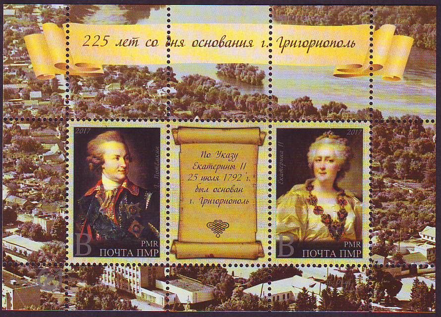 Второй выпуск в виде почтового блока посвящен 225-тилетию со дня основания города Григориополя.
