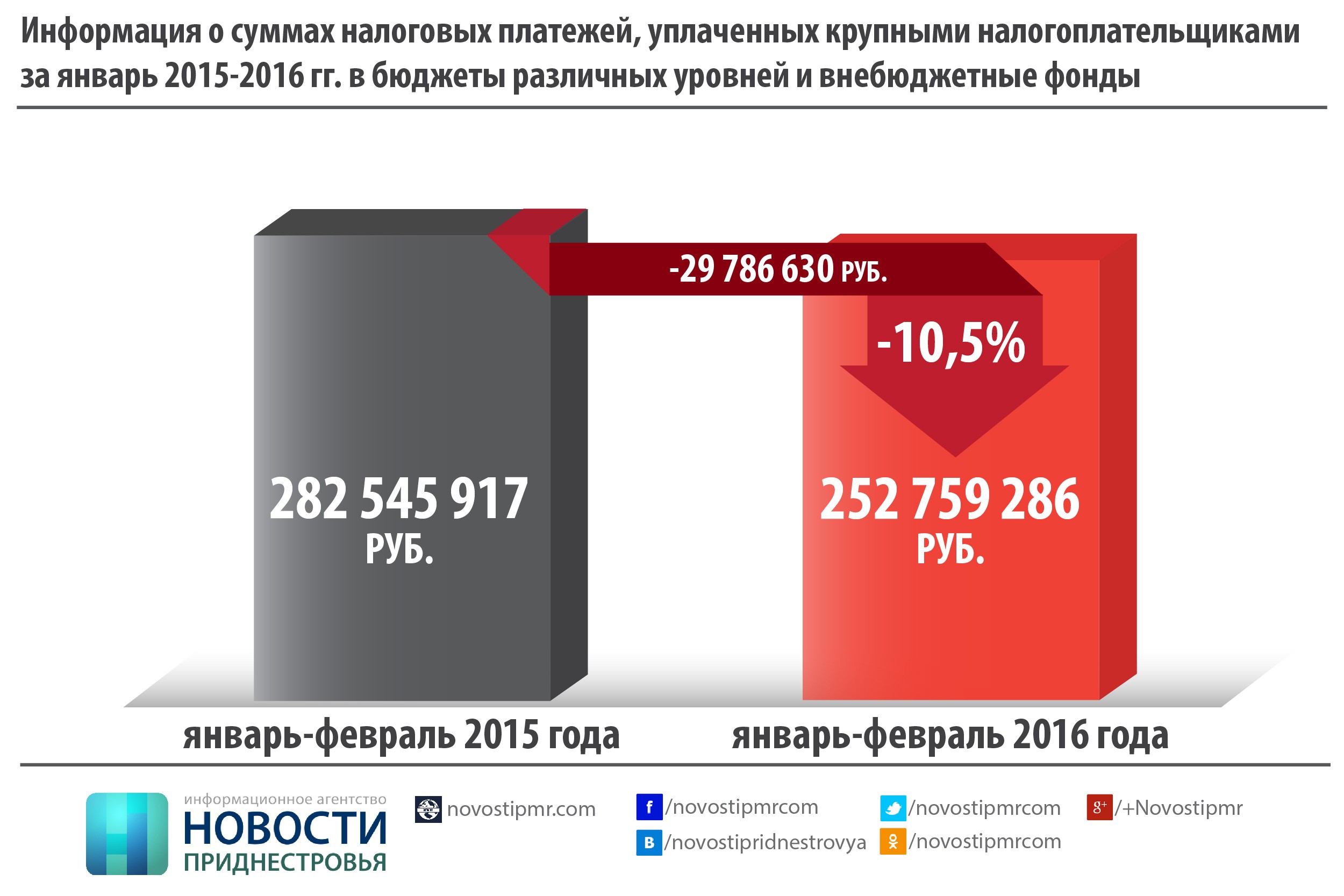 Минфин ПМР подготовил информацию о суммах налоговых платежей, уплаченных крупными налогоплательщиками за январь-февраль 2015-2016 гг. в бюджеты различных уровней и внебюджетные фонды