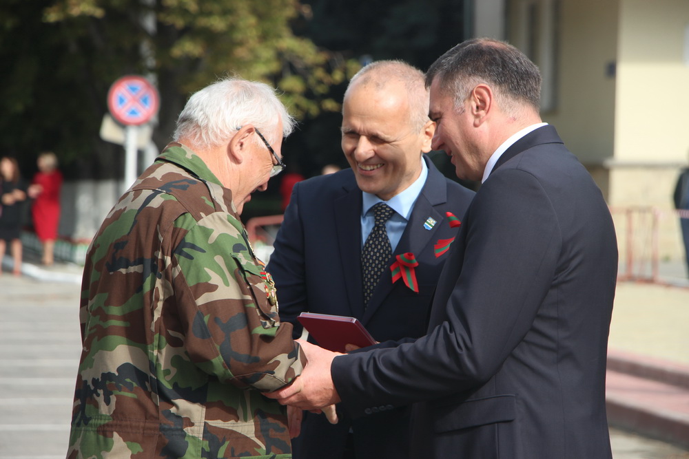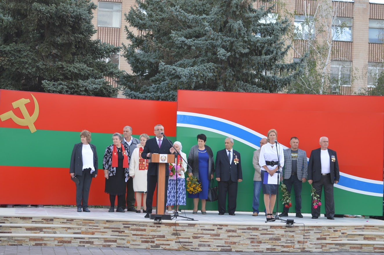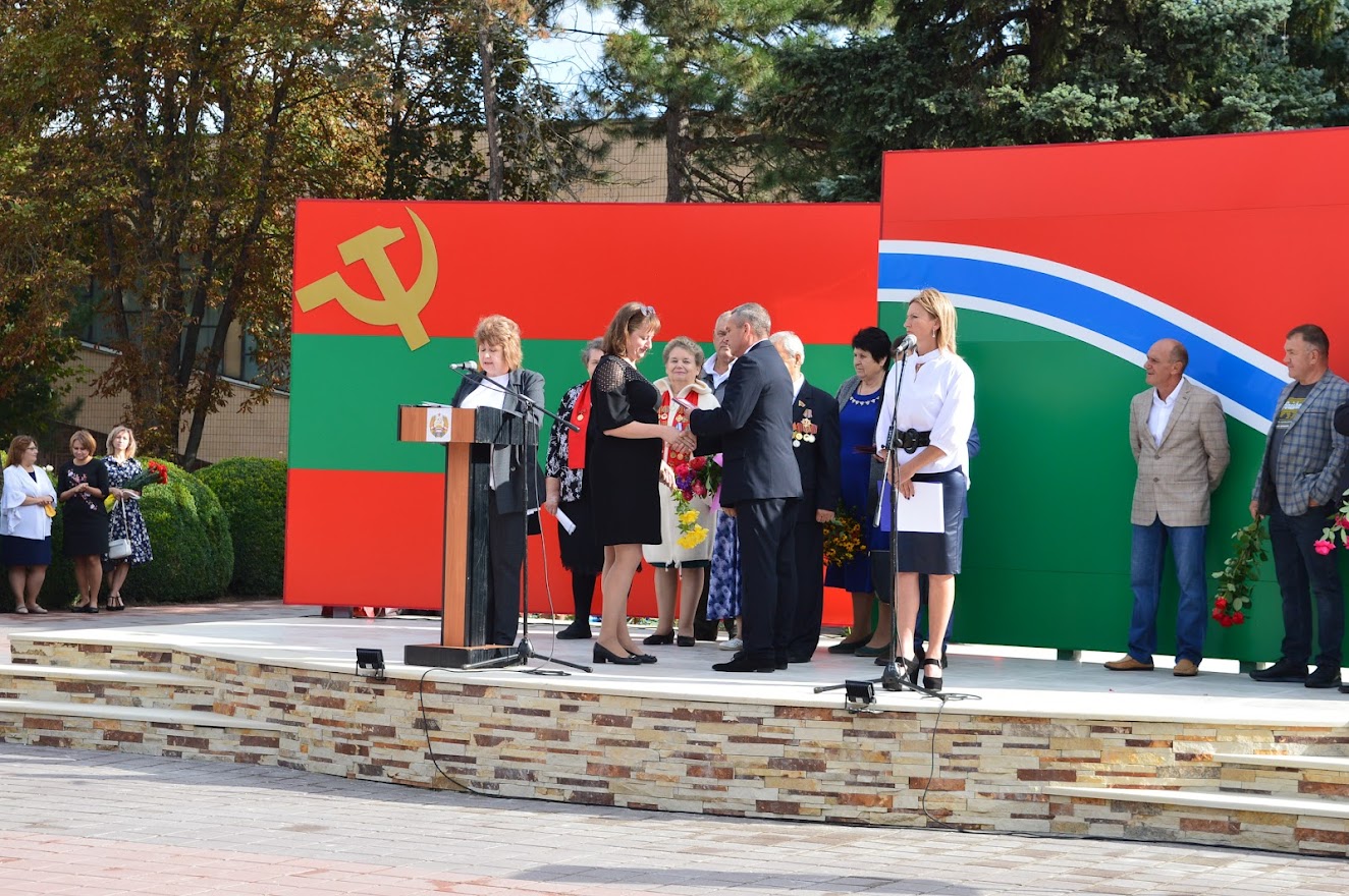 На площади Победы были подняты государственные флаги Приднестровья и России. Более сотни добросовестных работников города и района отмечены заслуженными наградами.