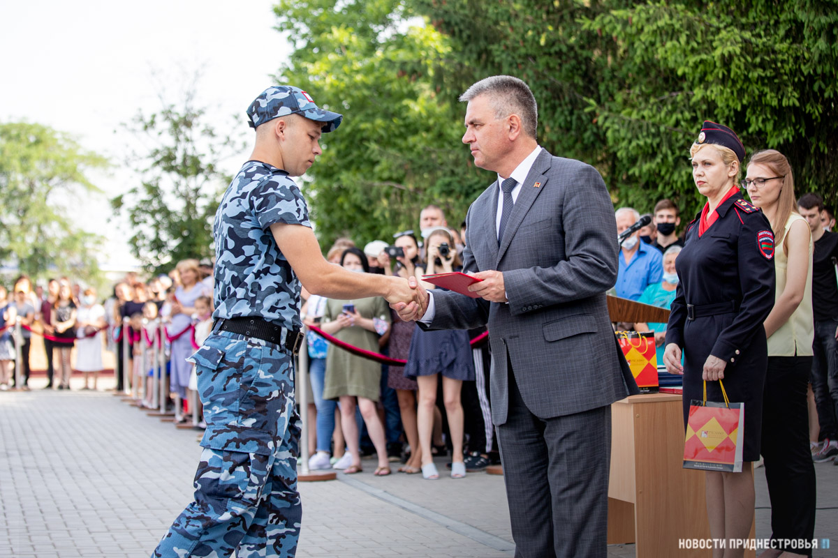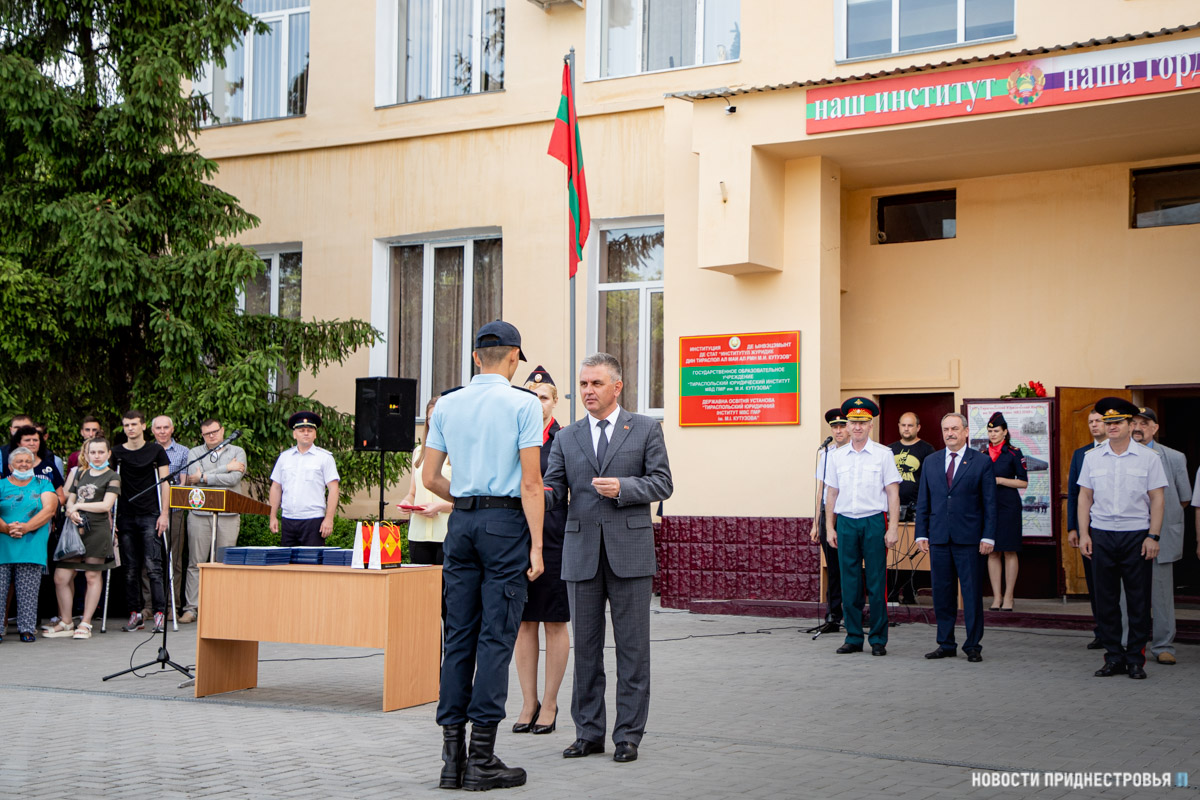 Тираспольский юридический институт в этом году окончили 62 курсанта, 7 из них получили красные дипломы. За активное участие в общественной жизни вуза лучшим курсантам Президент вручил ценные подарки.