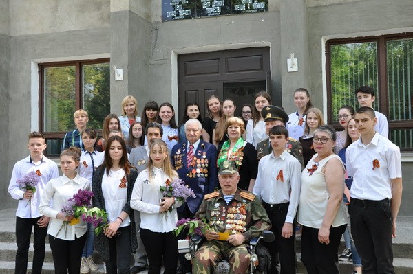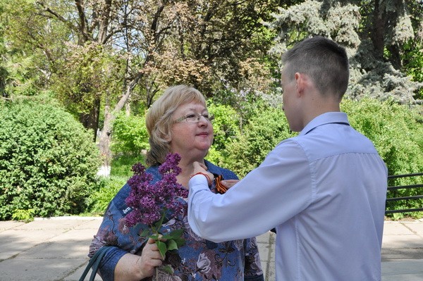 В продолжение школьники вышли на улицы города, где раздавали георгиевские ленты и дарили веточки сирени горожанам.