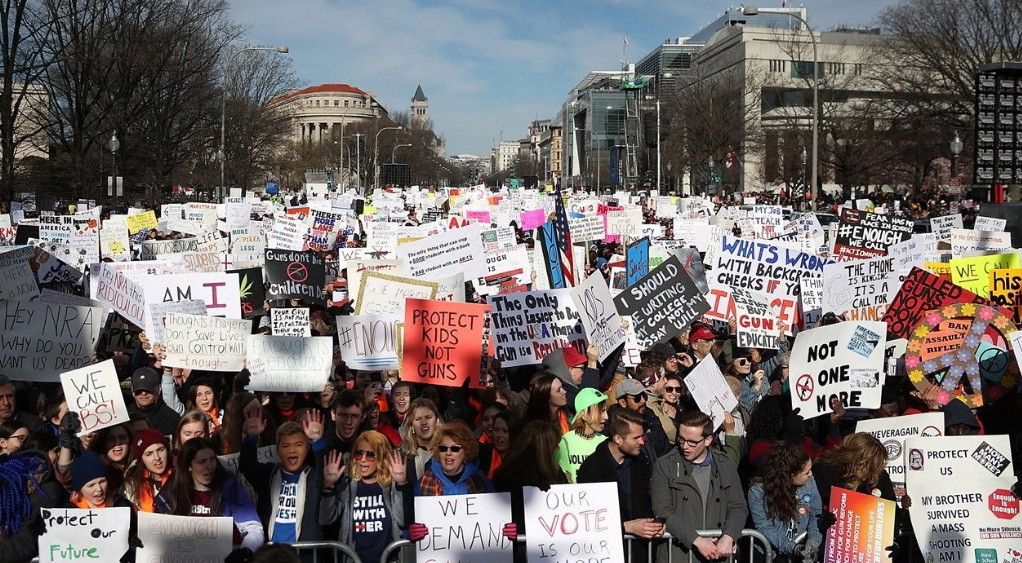 Десятки тысяч людей заполнили Пенсильвания-авеню, по которой они пройдут в сторону здания Конгресса на Капитолийском холме. Школьники всех возрастов, их родители и просто неравнодушные американцы вышли на улицы столицы США, чтобы потребовать от властей страны ужесточения контроля над огнестрельным оружием.