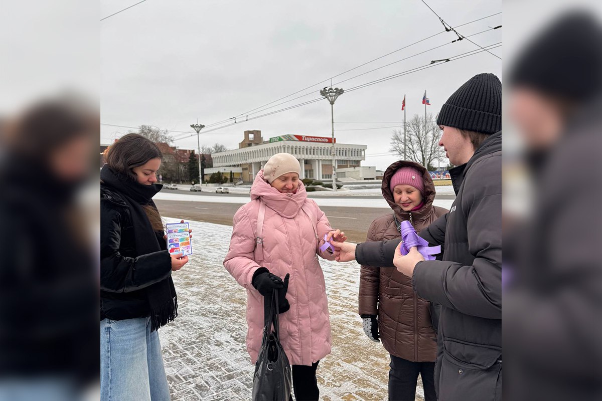 Кроме того, всем желающим вручались фиолетовые ленты - международный символ солидарности с людьми, столкнувшимися с онкологией, а также поддержки их семей и близких.