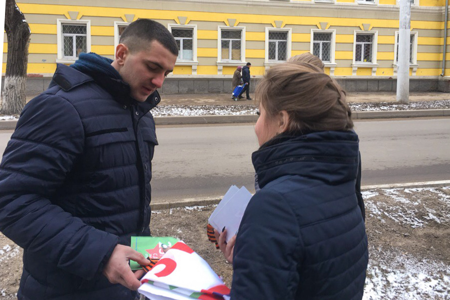 В День защитника Отечества участники молодежного движения желали мужчинам счастья, благополучия и крепкого здоровья, а также любви и хорошего настроения. Всего активисты раздали более 300 поздравительных открыток и георгиевских лент.