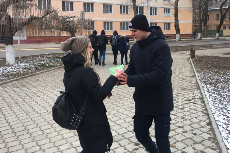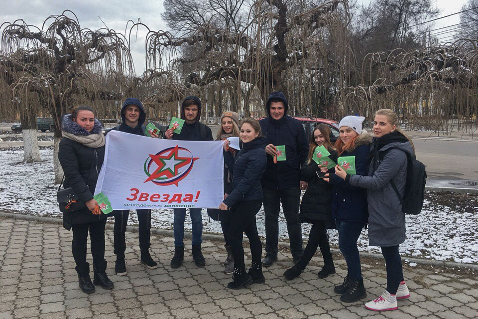 Тирасполь, 26 февраля. /Новости Приднестровья/. Активисты молодёжного движения «Звезда» устроили акцию ко Дню защитника Отечества в Тирасполе. Совместно со студентами ПГУ им. Т.Г. Шевченко ребята раздавали мужчинам поздравительные открытки и георгиевские ленты.