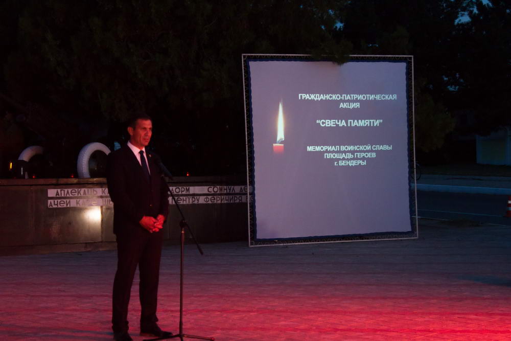 Траурные мероприятия в память о начале Великой Отечественной войны прошли по всей республике. Вечером 21 июня эстафету в акции «Свеча памяти» открыли Бендеры. Здесь на мемориальном комплексе Площадь Героев возлагали живые цветы к мраморным плитам с высеченными на них именами павших освободителей города. Десятки бендерчан и гостей города, в числе которых глава Правительства Александр Мартынов, зажигали свечи памяти в знак вечной благодарности защитникам отечества, сообщает пресс-служба Правительства.