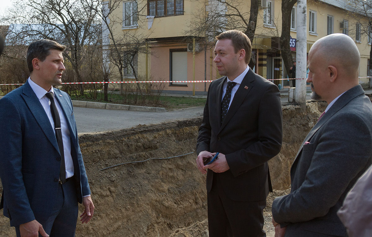 Тирасполь, 31 марта. /Новости Приднестровья/. Глава Правительства Александр Мартынов совместно с вице-премьером – министром экономического развития Сергеем Оболоником выехали на место ремонта по ул. Карла Либкнехта в Тирасполе. Там прокладывают новые трубы канализационного коллектора диаметром 300 мм, а водопроводные – 160 мм.