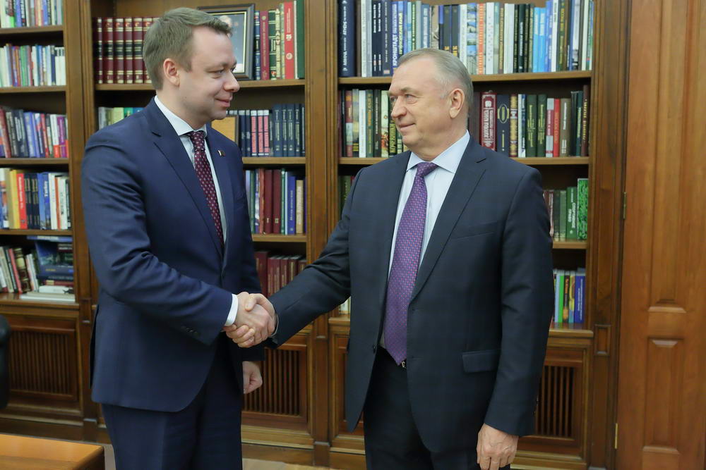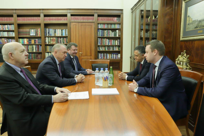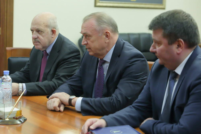 31 Окт., 2018, 17:14Тирасполь, 31 октября. /Новости Приднестровья/. Председатель Правительства Александр Мартынов и вице-премьер, министр экономического развития Сергей Оболоник провели встречу с главой Торгово-промышленной палаты РФ Сергеем Катыриным.