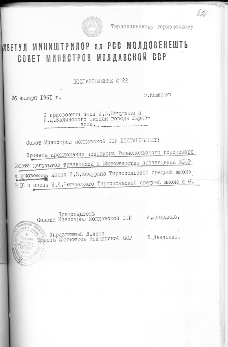 К этой дате Государственная архивная служба Приднестровья опубликовала архивный документ месяца, которым стала электронная копия Постановления Совета Министров Молдавской ССР № 22 от 26 января 1961 года «О присвоении имён И.В. Мичурина и Н.Д. Зелинского школам города Тирасполя» (Основание: Фонд № 107, Опись № 2, Дело № 100, Лист № 62.). Документ размещён на сайте Государственной службы управления документацией и архивами ПМР.