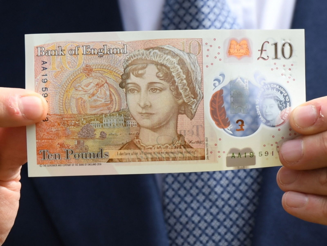 Купюра с Джейн Остин стала второй из серии полимерных банкнот, выпущенных Банком Англии. В сентябре 2016 года в Британии появились банкноты в пять фунтов с бывшим премьер-министром страны Уинстоном Черчиллем.