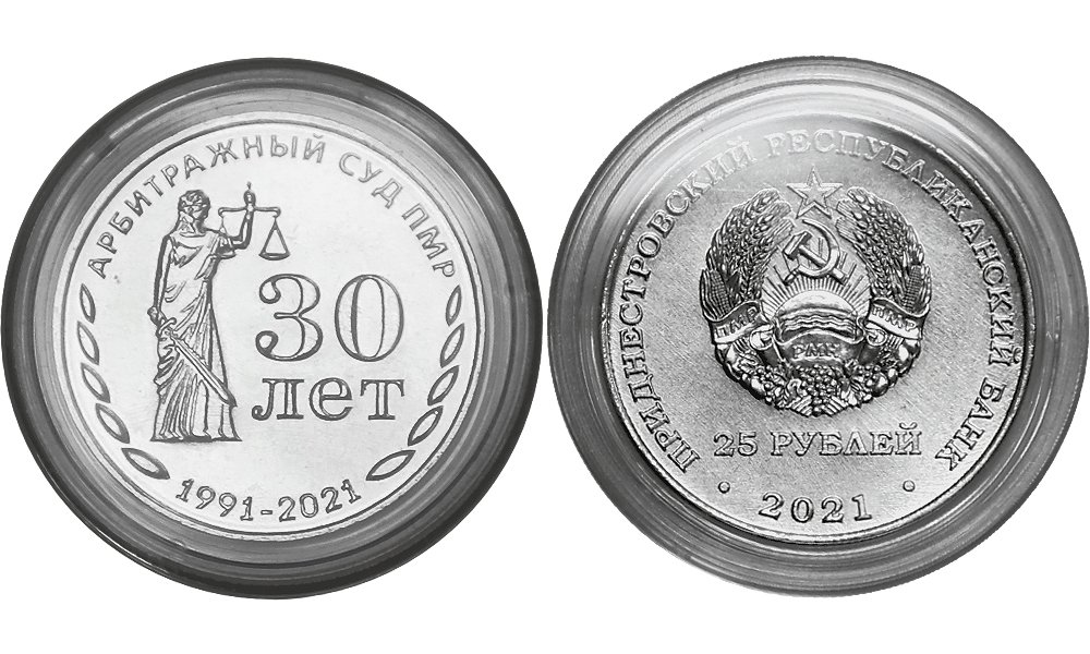 Тирасполь, 21 сентября. /Новости Приднестровья/. Приднестровский республиканский банк ввёл в обращение памятные монеты из недрагоценных металлов «30 лет со дня образования Арбитражного суда ПМР» серии «Государственность Приднестровья». Их номинал – 25 рублей, тираж – 2,5 тысячи штук, говорится в пресс-релизе Центробанка.