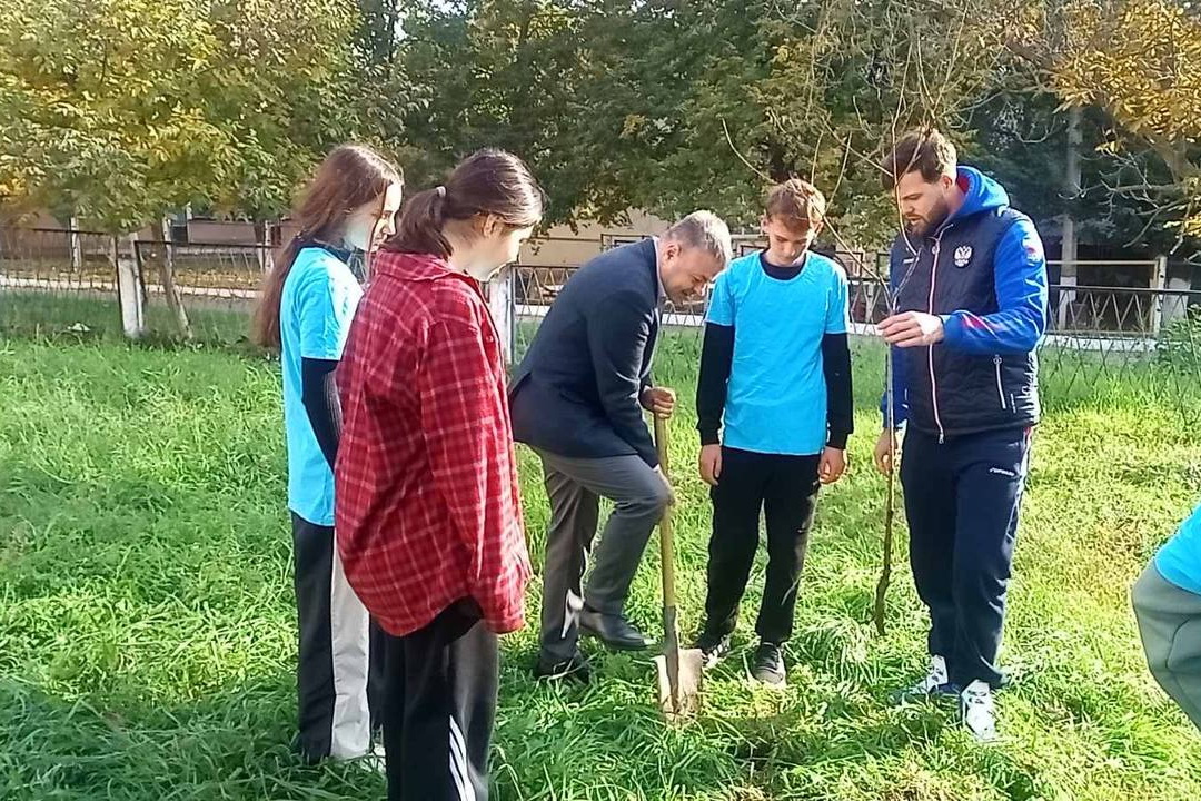 В завершение Егор Нечипорук и Николай Орлов вместе с учащимися высадили на территории школы № 15 полсотни деревьев: яблони, вишни, фундук и туи.