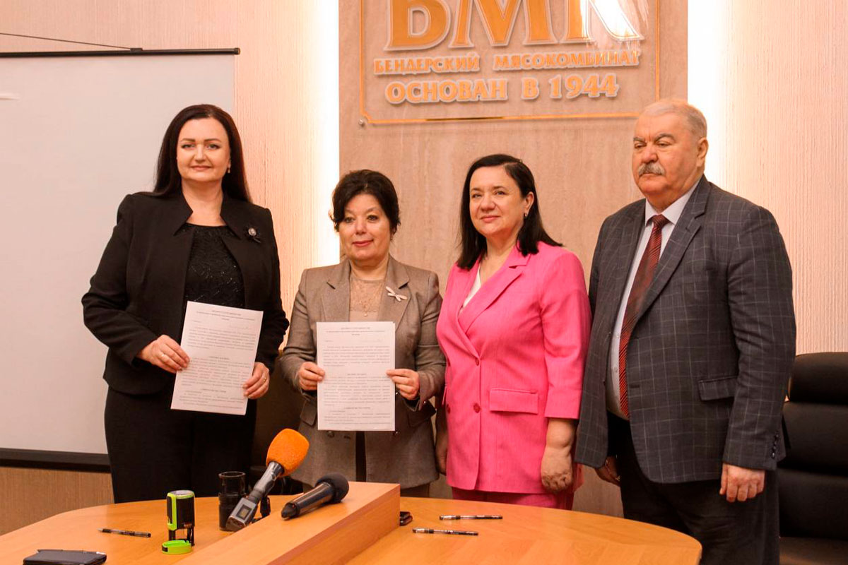 В подписании договора приняли участие министр просвещения Светлана Иванишина, президент Торгово-промышленной палаты Василий Кожан, директор ЗАО «Бендерский мясокомбинат» Валентина Зубкова и директор столичного колледжа технологий и управления Оксана Дениченко.