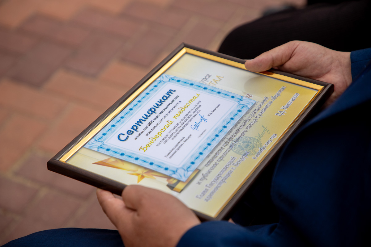 Далее на главной сцене Александро-Невского парка прошло награждение лауреатов ежегодного конкурса «Бендерский пьедестал». Победители в каждой из 15-ти номинаций – жители Бендер, внёсшие вклад в развитие города. Это педагоги, врачи, экономисты, спортсмены, работники культурной, социальной и коммунальной сфер. Кроме этого, за особые заслуги некоторым горожанам вручили госнаграды.
